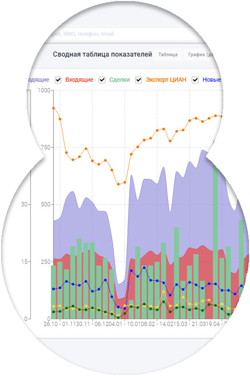 Это точечный анализ основных этапов работы с клиентами всех типов; рекламного бюджета; ёмкости портфеля клиентов и его привлекательности + сегментация по цене, параметрам и географии; продаж с сегментацией услуг (продажа, сопровождение, аренда, новострой, ипотека); динамики изменений в подразделениях, а также это оценка качества услуг и подготовки сотрудников (запись звонков, восклицательные знаки без звонков)